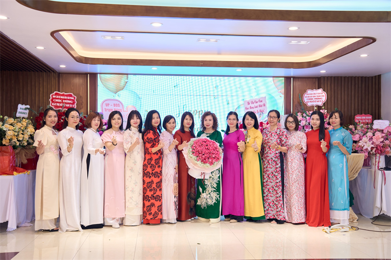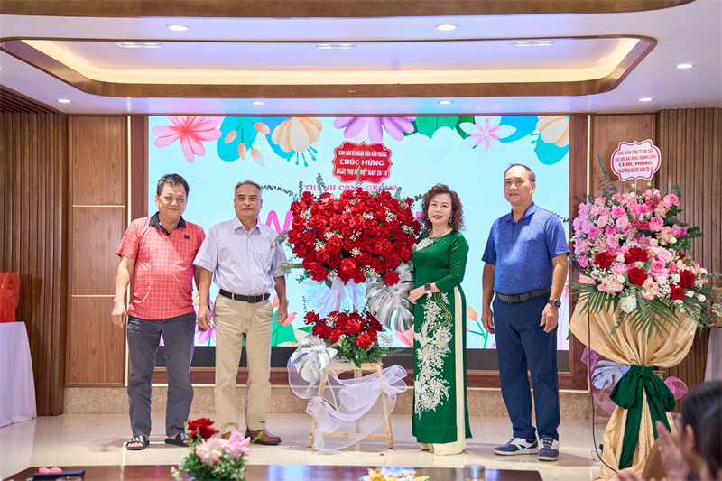Các nam cán bộ nhân viên tặng hoa chúc mừng các chị em, Tổng giám đốc Nguyễn Thị Tâm Hoa thay mặt nữ cán bộ nhân viên nhận hoa