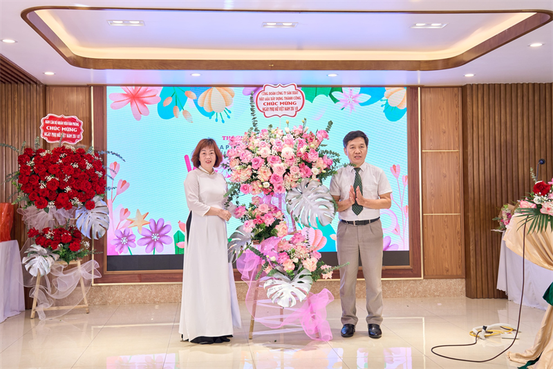 Công đoàn công ty tặng hoa chúc mừng, bà Nguyễn Thị Tuyết Mai thay mặt các chị em nhận hoa